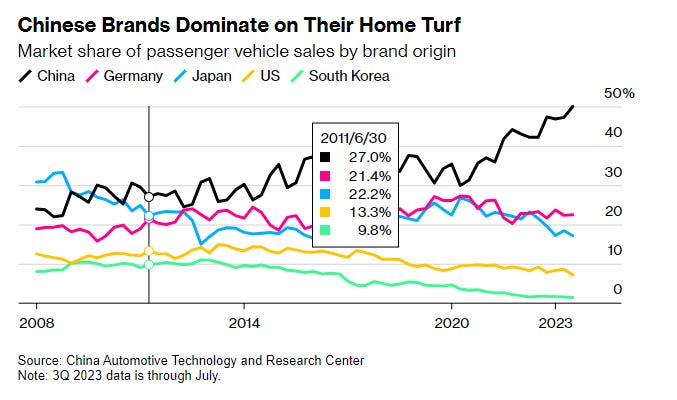 China has nearly halved its imports of German cars in the past five years as competition with its domestic automakers increases.